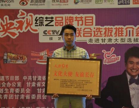 歷時一個月,由天源9號全程總冠名、中央電視臺綜藝節(jié)目部、中共甘肅省委宣傳部、甘肅省文化廳等10家部委聯(lián)合主辦的“天源9號攜手央視綜藝品牌節(jié)目聯(lián)合選拔——走進甘肅大型選拔賽”,7月20日在國芳百貨一層大廳圓滿落幕,天源9號獲“文化大使”殊榮。甘肅九通置業(yè)有限公司董事長趙明代表天源9號獲得由中央電視臺綜藝頻道節(jié)目部聯(lián)合中共甘肅省委宣傳部等十家部委頒發(fā)的“文化大使 友誼長存”的榮譽獎狀。