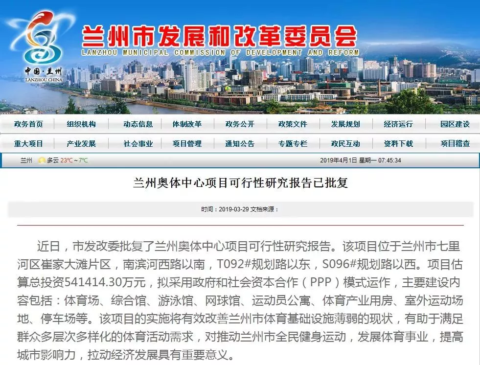 3月29日,蘭州市發(fā)改委官方網(wǎng)站發(fā)布公告稱,蘭州奧體中心項目可行性研究報告已批復(fù),計劃于4月30日開工。與此同時,蘭州公共資源交易中心受蘭州市體育局委托,正對該項目監(jiān)理公開招標(biāo)。項目總投資約54億元。計劃于4月30日開工,2022年5月30日竣工。